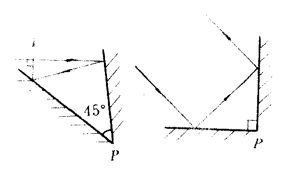 图2 使两个以上的平面镜彼此保持固定的夹角,组成平面反射镜组,叫角镜,可以更有效地控制光路的改变。常用的有两镜夹角为45°的45°角镜和镜面互相垂直的90°角镜(见图3)。和两镜垂直的平面叫主截面。所有在主截面内的入射光线的方向经角镜反射后将改变镜夹角的2倍,即使角镜绕两镜的交线P转动,偏折角始终恒定。在一些光学仪器中使用角镜,保证工作的可靠性。物体通过角镜可成多个像。改变镜夹角,像的个数将随之变化。像个数n与镜夹角的关系为n=360°/α-1(α为镜夹角)。由三个互相垂直的平面镜组成的空心锥镜(见图4)的特点,是无论光线沿什么方向射到哪个镜面上,出射光线必定与入射光线反向。