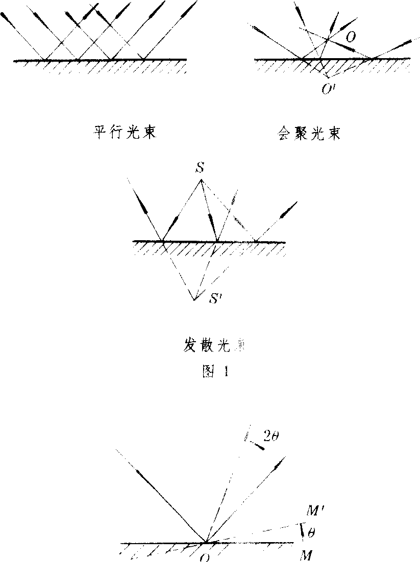 | 释义 | 平面镜 平面镜pingmianjing镜面为平面的反射镜。依照光的反射定律,平面镜只改变光束的方向,不改变光束的单心性。如图1示经过平面镜的反射,平行光束仍为平行光束,会聚光束仍为会聚光束,发散光束仍为发散光束。光点发出的发散光束经镜反射后,反射光线的反向延长线交于镜后的一点,这就是光点的虚像。像物等大,对称于镜面,因而正立,且是反像。如果保持入射光线不变,使平面镜转过角θ,则反射光线将偏转角2θ,如图2示。利用这个特点,可将微小变化放大,被称作光杠杆放大作用。在测万有引力恒量的卡文迪什扭秤中应用了这一作用。