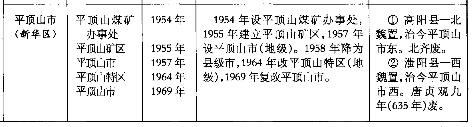 平顶山市(新华区)平顶山煤矿办事处平顶山矿区平顶山市平顶山特区平顶山市1954年1955年1957年1964年1969年1954年设平顶山煤矿办事处,1955年建立平顶山矿区,1957年设平顶山市(地级)。1958年降为县级市,1964年改平顶山特区(地级),1969年复改平顶山市。❶ 高阳县—北魏置,治今平顶山市东。北齐废。❷ 滍阳县—西魏置,治今平顶山市西。唐贞观九年(635年)废。