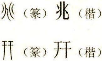 為了方便先釋“兆”。 “兆”甲金文未收,相比之下它是個後啟字,很可能是戰國時期的造字。 小篆的“兆”(兆),是“☷”的轉換:將兩個陰爻轉換成兩個“八”,將一個陰爻轉換成“乙”(乙也是水),然後組合在一起形成了“兆”的狀態。 楷書的形狀更為清晰:“八”對“⚏”分而化之。 “兆”是個典型的會意字,會意就會意在八對水的分解、分析。《說文》釋為象形字是不正確的,釋“灼龜坼也”也僅為它的一個引伸之意。 “兆”的本意是通過分析,對事物的徵候或跡象有所發現。引伸有以下意項: (1)以灼龜之坼預示吉凶。 (2)發現、看見,如本題目所示。 (3)事物開始的徵象,《左傳·哀公元年》:少康“能布其德,而兆其謀。” (4)祭祀的界域,《周禮·春官·小宗伯》:“兆五帝於四郊。” (5)數詞。如億兆。 “兆”還異構了許多漢字,可以說形成了“兆”的家族。由於“兆”是分析而見得,它的家族成員有個共同的性格:具有水的蘊質,輕易、快捷,易見、易得。 佻:(ㄊ丨ㄠ)從人。兆的擬人,“兆”的輕薄;“兆”的竊取;“兆”的敏捷。佻佻( 丨ㄠ)則是“兆”的獨行美貌的形態。 窕:從穴。穴,在這裏標意女性,《廣韻》:“善心曰窈,善色曰窕”,《詩經·周南·關雎》:“窈窕淑女,君子好逑。”《說文》:“深肆極也”,是說從遠處看到的美色。 挑:從手。“兆”的動作。手對“兆”的挖取、選揀,襟袂間的“兩挑”就是經過選揀挖取有所比較、有所見長的乘龍快婿。 恌:(ㄊㄧㄠ)從心。心對“兆”的菲薄、輕漫,《詩經·小雅·鹿鳴》:“視民不恌,君子是則是傚。” 咷:從口。(ㄊㄠ)張口哭出的聲,《易經·同人》:“同人先號咷而後笑”。(ㄊ丨 ㄠ)“兆”的歌聲,《漢書·韓延壽傳》:“望見延壽車,噭咷楚歌”。 洮:(ㄊㄠ)從水。水名,在今甘肃臨洮。洮河綠石稱洮硯,綠如蘭,潤如玉,發墨不亞端溪,北方最為稀貴,得之為寶。硯,見石也。臨洮硯,稀世之物。 逃(跳):從辶(足)。“兆”的離去。 垗:(ㄓㄠ)從土。“兆”的葬地。 狣:(ㄓㄠ)從犬。輕捷得力,善於發覺的犬,《爾雅·釋畜》:“絕有力,狣。” 姚:從女。“兆”是水,水也即女,女中之美,《左傳·哀元年》:少康“逃奔有虞,虞思於是妻之以二姚。”是說虞思把倆美女許為少康作妻。 桃:從木。兆是事物徵候的一種表象;木有標杆意,因此“桃”有以下意義: (1)“兆”即面頰,桃夭就是以桃花盛開比男女之夭冶。 (2)“兆”即木人,桃人就是以桃木削製的人形,用以驅邪。 (3)“兆”即果實,桃李就是以桃李之華實喻門生之眾多。 (4)“兆”即境域,桃源就是“兆”之美境,晉·陶潛為古今人們設計了一個華胥之國。 (5)“兆”即符咒,桃符是早期人類自然崇拜流落民間的習俗,相傳黃帝以桃梗代門神,周代盛行,它是春聯的前身,王安石就有“總把新桃換舊符”的詩句。 祧:(ㄊ丨ㄠ)從示。“兆”為初始,古代始祖之廟曰祧。 旐:(ㄓㄠ)從。招魂之幡,為“兆”招魂,晉·潘岳《寡婦賦》:“龍轜儼其星駕兮,飛旐翩以啟路。” 朓:(ㄊ丨ㄠ)從月。夕陽西下時月見於西(月初),《漢書·張敞傳》:“月朓日蝕,晝冥宵光”。朓朒(ㄋㄩ),唐·李淳風《注》:“盈者曰之朓,不足者謂之朒”。 眺(覜):從目(見)。“兆”的遠視,《呂氏春秋·仲夏季》:“可以居高明,可以遠眺望。” 頫:從頁。頁為人的頭部, (1)(ㄊ丨ㄠ)相視,《爾雅·釋詁》:“監、瞻、臨、涖、頫相視也。” (2)(ㄈㄨ)俯視,《漢書·項羽傳·贊》:“百粵之君頫首係頸,委令下吏。” 鞉:(ㄓㄠ)從革。有柄之鼓,手搖發輕揚之聲,《詩經·周頌·有瞽》:“應田懸鼓,鞉磬柷圉。” 烑:( 丨ㄠ)從火。水火相濟,“兆”的明亮,《淮南子·要略》:“挾日月而不烑,潤萬物而不耗。” 接下來釋“幵”。 “幵”和“兆”都有發現、看見的意寓,“兆”偏重於橫向的平面,而“幵”則偏重於縱向的深度。 “幵”(ㄐ 丨ㄢ), (1)坤為水,是坤卦符號“☷”的轉換,將一個陰爻轉換成“八”。 (2)“⚏”(太陰)也為水,“八”對“⚏”分解。楷書因之(有時也訛作“开”)。 如果說“兆”是八對水的闊遠橫向分解、分析之所見的話,那麼“幵”就是八對水高深縱向分解、分析之所獲。 “幵”的本意是對水高深分析之所獲。 “幵”字書釋義有兩項:一是山名。幵頭山,崆峒山脈,以高聳得名,在甘肃平涼縣西四十里。二種族名。幵為古羌族分支,《漢書·地理志》:“天水郡罕幵縣”,罕幵人居於此。 “幵”從原本形意所異構的漢字有: 岍:(ㄑ丨ㄢ)從山。山名,岍山即今吳山,在今陝西寶雞市陳倉區,殷商晚期周太王古公長子吳太伯所居,因以易稱。 汧:(ㄑ丨ㄢ)從水。水泱入澤者謂汧。汧水,渭河支流,源起甘肃六盤山,經汧陽在寶雞入渭。古以河中深處出五色魚,故也稱龍魚川。陽,縣名,在陝西,今被改爲千陽,其有的文化含帶丢失。 研:從石。磨碾深究,故有高深蘊意的研究、研求、研味、研討、研核、研精、研窮、研摩、研鑽等以“研”而構成的向高深層次挺進的雙音詞。 笄:(ㄐ丨)從竹。古代男女插入髮髻的竹製長簪,女子十五歲(長高了)稱笄年。 鈃:(ㄐ丨ㄢ)從金。高足酒器,《釋文》:“鈃似小鐘而頸長。” 豜:(ㄐ丨ㄢ)從豕。豬一歲曰豵,三歲曰豜,《詩經·豳風·七月》:“言私其豵 ,獻豜于公。”是說小豬留給自己,大豬繳於公家。 枅:(ㄐ丨 )從木。柱上之方木稱枅。《淮南子·主術》:“短者以為朱儒枅櫨。” 趼:(ㄐ丨ㄢ)從