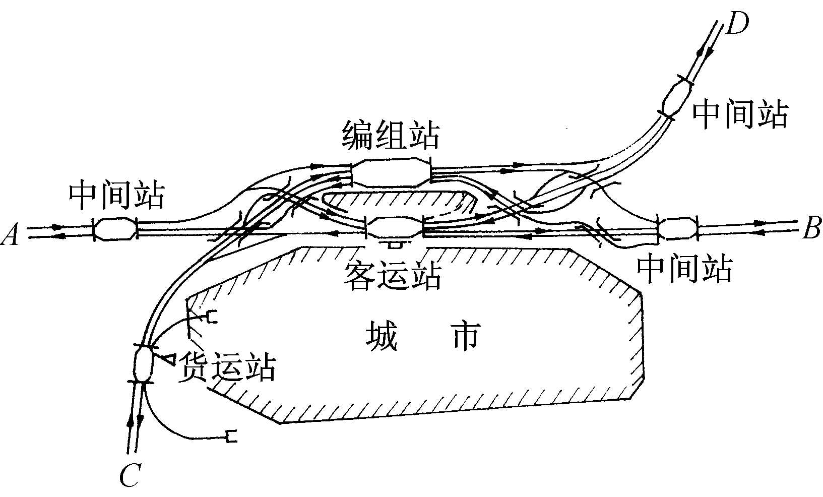数个方向铁路干线引入,并按枢纽内旅客列车进路和货物列车进路完全独立分开设置的设计原则,将客运站和编组站分散平行布置的铁路枢纽。为保证客货列车进路的顺畅和避免相互干扰,该类枢纽的进站线路大都采用较复杂的立体疏解布置,因而占地较多,并对城市造成分割。但此种布局较易实现将客运站设于市区而将编组站设于郊区,从而减少铁路对城市的一些干扰,又能更好为旅客服务。客货进路完全分开将使枢纽有很大的通过能力。但枢纽总体布局复杂,工程建设费用很大,运营支出也将增加,并对城市和枢纽的发展也有一定的局限。