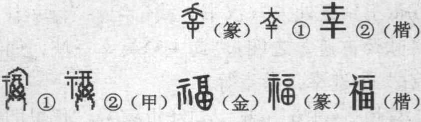幸,从不幸的怪圈中向我们走来。不信么?有古字形作证。 小篆的 “幸”,从夭,从屰,为会意字。夭,甲骨文、金文写作 “ ”, 像人甩开两个臂膀, 大步流星的样子。“屰”,是 “矢” 在甲骨文、金文时的倒置。“矢”为箭,倒置是箭矢落地的标意。小篆的 “幸” 全字给我们提供的信息是:当箭矢来临的那一瞬间,由于身躯的快速反应和灵活摆动,使箭矢落地。中箭落马,乃为不幸;箭头落地,那就是不幸中的万幸了。“幸”,从此就是这样大步流星地跨入人世,并立即被一张张笑脸迎接有加。幸的本义是幸存,幸免,幸运,侥幸,不幸中的万幸。从本意引申有: (1)逢凶化吉,《左传·僖公十五年》: “韩简退曰:‘吾幸而得囚。’” (2)不幸,《论语·雍也》: “不幸短命死矣。” (3)喜庆,柳宗元《骂尸虫文》: “妒人之能,幸人之失。” (4)希望,明代宗臣《报刘一丈书》: “幸勿阻我也。” (5)宠爱,古代帝王对某嫔妃的偏私,《战国策·楚策》: “君王卒幸四子者不衰。”如得幸,宠幸,幸临等。 (6)帝王到某处去,《汉书·武帝纪》:“行幸甘泉宫。”杜甫《咏怀古迹》之四: “蜀主窥吴幸三峡,崩年亦在永安宫。” 如巡幸,游幸等。 (7)喜悦,《史记·越王勾践世家》: “长男即自入室取金持去,独自欢幸。” 如幸喜、欣幸等。 (8)希望,《楚辞·九辩》: “霜露惨悽而交下兮,心尚幸其弗济。” 《说文》按小篆形体作出了这样的解释: “幸,吉而免凶也。从屰,从夭。夭死之事,故死谓之不幸。”许慎析形正确,但释意不免牵强。 楷书❶的“幸”,是小篆形体的隶变。楷书 ❷的“幸”,是进一步文字化的处理,将小篆和楷书❶上端的 “大”(即人)讹变为 “土”,并与楷书的 “㚔”(音聂, 是甲骨文时代的一种刑具,相当于现今的手铐)发生混淆,从此便制造了一个汉字释解中的小小麻烦。于是,“幸”便有人这样解释说:“帝王的阳具似手,被宠妃锁进了似梏的阴户里,然后双方齐叫 ‘幸福’。真不知帝王是自由人呢,还是另一种囚徒。” (《世民解字(1)》 157页。赵世民著,广西人民出版社2003年9月出版)一位连“幸”的音读都尚未弄准的学者,却在那里绘声绘色地说起“幸”来,这无异于对庄严汉字庄严的亵渎。当然,在甲骨文出土后一百多年的今天,汉字的重新释解呼唤着 “百花齐放,百家争鸣” 的到来,但是毕竟是从先秦以来至少两千五百多年研究基础之上的 “齐放” 与 “争鸣”。不顾“基础” 的 “放” 与 “鸣” 还是悠着点好。 福,人们一般理解就是幸福,而幸福往往也是一种感觉。人们对它的感觉如何,这要从 “福” 的字理上去寻找。让我们首先还是去寻找原始人的那种感觉吧。 甲骨文的 “福”,是由双手(廾)举 “酉” (盛酒的樽), 向 “示” (即 “丅” 祖先神位)上洒酒, 酒滴四溅的、具有象形韵味的会意字。“福”,殷墟卜辞用作祭祀名,“子渔疾目,福告于父乙。” 子渔,商王武丁之子,是说子渔眼睛生了病,以祭祀的形式祈求武丁父亲小乙的神灵赐福。也用作用牲法,“其佑祡于父丁福一牢。”牢是牛经过特殊饲养后作为祭祀的牺牲享牛。是说用烧柴焚燎和宰杀牢牛作牺牲祭品的祭祀形式,向父丁(祖庚、祖甲称生父武丁)神灵祈福。 “福”,父系家庭出现以后的造字。读者诸君,请莫要忽视汉字中的 “示” 字。 “示” 在甲骨文中为 “丅”,是祖宗之 “祖” (⊥)的倒置,是祭坛上供奉的主体,是祖先神灵在人们意识中的再现,汉字中尽管它以偏旁参与组字,但都具有神圣、神秘、祭祀、祈求、祈祷的意蕴。“示”,是男性生殖崇拜意识的固化。“示” 是通神的。 甲骨文❶的 “福” 它的取象是在 “广” (音掩,房屋的标意)下,双手高高捧起盛满酒液的酒具,将酒液向祭祀的神坛洒去。甲骨文 ❷的“福”简化了房屋的标意,其含意未变。福的原始造意是祈福,是通过对祖先神灵的祈祷,求得心理上某种欲望的实现。是祈福,即祈求幸福,而并非得到和享用幸福。实想,这祈福的酒给神间的神灵喝下去,神灵一高兴,就会赐福于人。岂不知神间和人间一样,“神灵” 往往也是吃拿卡要的主儿,它总是 “高兴” 的机会不多,因此“幸福” 也就与人远离。祈福是一种公共场合公开的集体行贿,即使贿赂通了人神,幸福也未必能够降临于祈福者的头上。 幸福总是与苦难不愿搭界,在那残酷的生存环境下,提供给生命的自然资源极度匮乏,风刀霜剑,猛兽危害,疾病死老,人的生存实在不易,活着的人有说不出的无奈。祈福不过是求得一时的心理平衡,恰如今人买个“福” 字,倒贴在家门之上,自作自画地以为 “福到了”一样的自欺和一样的需要。 金文的 “福”,与小篆、楷书形体一脉相承,比起甲骨文来,已脱离了象形韵味,归于形声字的轨道。从示,从畐,畐亦声。“畐” (音伏)《说文》: “满也。” 这时的 “酉” 已经不是盛酒的器具了,已从酒具的形状中分化出了一个 “畐” 字来,是盛满了酒液,还是装满了五谷,得去向许慎请教。无论是盛满了美酒,还是装满了粮食,“畐”都是充实美满的象征。“福”,一边有“示”这个保护神的护佑,一边是充满酒食的酒缸粮囤,一看就知道是个 “福如东海” 的景象,无论在什么地方,只要有它的存在,个个自然准会坠入福海。 “福” 的本义是,以祭祀的形式祈求福临,《左传·庄公十年》: “小信未孚,神弗福也。” 从本义引申的有: (1)与祸相对,《左传·襄公