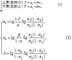 ❹2α及β。根据试验标准规定的θ、2α与β可得出双向序贯试验图四条界限的直线方程为: