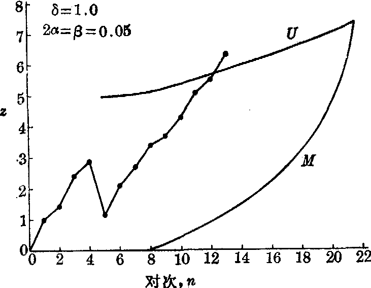 ❹2α及β。根据试验标准所规定的δ1 、2α与β,由表2查得用于开放型双向序贯t检验的边界点坐标,并联结成上、下两界限。上界U略呈弯曲,代表A优于B或B优于A的界限;下界M为近似直线,代表A与B无差别的界限。横轴n代表对子数,纵轴z=(∑d