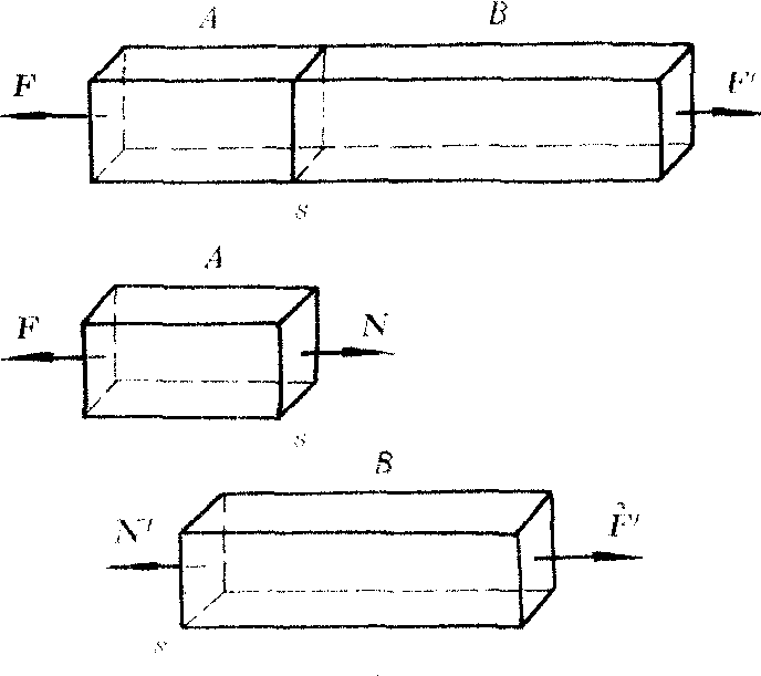 另见:力气 力量 ☚ 力 能量 ☛ 应力 应力yingli物体由于外因(受力、温度变化等)或内在缺陷而发生形变时,在其内部任一截面单位面积的两方所出现相互作用的内力。应力可分为正应力和切应力。如图1所示。 长方体直杆AB两端受到大小相等、方向相反、在同 一直线上的拉力F和F′的作用后产生拉伸形变,直杆处于平衡状态。两拉力是外界物体对直杆作用的外力。设想从直杆任一横截面s处将其截成A、B两段,A段的一端仍受到外力F的作用,另一端则受到B段对它的作用力N。N是由于形变而在物体内相邻两段间产生的相互作用力,即内力。实际上,N是B段左端截面的大量分子对A的右端截面的分子吸引力的合力。因为处于平衡状态,所以F=-N。与横截面垂直的内力(N)同横截面面积(s)的比,称为正应力(σ)。其公式为:σ=N/S或σ=F/S如果物体内部的结构不均匀,例如有缺陷或裂痕,则过这种位置的横截面的内力分布不均匀,由此式计算出的应力,便不能准确地反映物体内部的真实应力分布情况。为了表示某点的应力,在横截面内取面元△s,使该点位于面元内,设作用于面元△s上的内力为△N,则公式 表示该点上的正应力。 当物体发生剪切或扭转形变时,都会产生切应力。如图2,长方体底面有 一向左的拉力F,其顶面有 一向右的拉力F′,这两个力大小相等,方向相反。在这一力偶矩的作用下,长方体发生剪切形变。如果平行于底面的某一截面上所受到的剪切内力为N,那么与截面平行的剪切内力(N)与截面积(s)的比称为切应力(τ)。其表达式为τ=N/S。物体内某点的切应力与正应力一样计算即 。液体内部各点的静压强也是一种应力。如图3所示,在液体内固体表面上各点都受到液体的静压强,即应力。这种应力与固体内正应力 一样,在液体内部任取的假想面上,都有垂直于此面的应力。不论固体表面是什么形状,固体表面上任何地方所受到的液体静压强总是垂直于表面。在国际单位制中,应力的单位为牛顿/米2(N/m2),称为帕斯卡,简称帕Pa)。