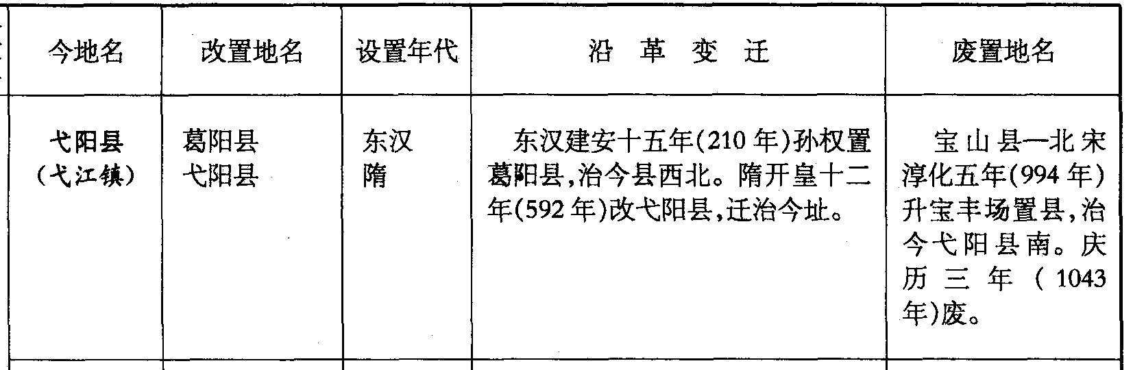 弋阳县(弋江镇)葛阳县弋阳县东汉隋东汉建安十五年(210年)孙权置葛阳县,治今县西北。隋开皇十二年(592年)改弋阳县,迁治今址。宝山县—北宋淳化五年(994年)升宝丰场置县,治今弋阳县南。庆历三年 (1043年)废。