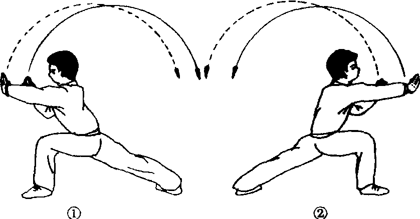为弓步与双摆掌同时完成的基本动作。可以左弓步双摆掌与右弓步双摆掌依次反复练习。教学重点 强调: ❶双掌摆动要经过头顶上方再至体侧。❷反复练习时,身体重心要平移。