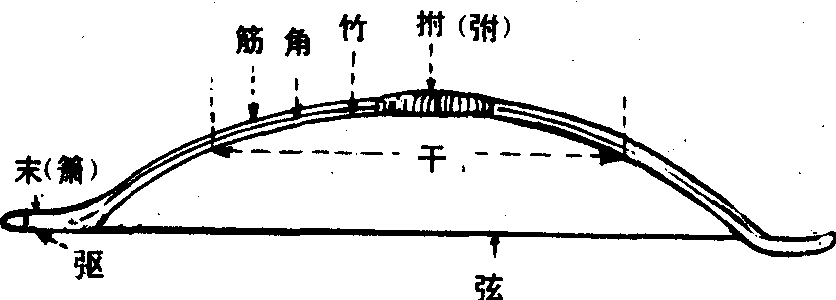 弓的各部位名称为:末(箫)、彄、弦、干、筋、角、竹、拊(弣),见图。