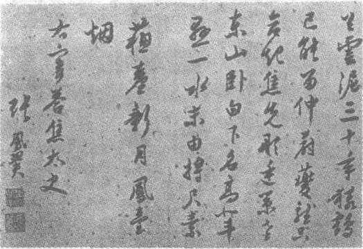 明。纸本。纵33.1厘米,横62厘米。江苏省苏州博物馆藏。张凤翼(见《张凤翼行草书五言诗》条目)书。此幅是选自《明代名人(二十家)字册》册页:“同门殊路自飞蟠,回首云泥三十年。猿鹤已能留仲蔚,夔龙只合起焦光。彤廷策老东山卧,白下名高北斗悬。一水末由将尺素,苏台新月凤台烟。”款署:“右寄答焦太史,张凤翼。”书体深得二王之法,笔致挺拔,结体流畅灵动,法度严谨,有飘如杨柳、漾若春风的美妙自然意象。