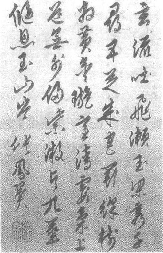 明。纸本。纵48.5厘米,横32厘米。江苏省苏州博物馆藏。张凤翼(明嘉靖二十九年—明崇祯九年,即公元1550—1636年),字伯起,长洲(今江苏省苏州)人。嘉靖四十二年与其弟张燕翼同领乡荐,凤翼中举。好填诗词文,与弟献翼、燕翼三人皆有文名。善书,晚年不仕,卖书自给。明王世贞《艺苑卮言》云:“张贡生小楷拟《曹娥》,精雅有致,微伤矜局。”又云:“伯起平生临二王最多,退笔成冢,虽天趣小竭,而规度森然。”著有传奇《红拂记》等,又有《处实堂集》、《文选纂注》、《占梦类考》《海内名家工画能事》等书。此幅行草五言诗:“玄流吐飞濑,玉梁隽千寻。五芝成宫阙,绛树为黄金,璇室清霞气,上道无外侵。紫微顷九华,偃息玉山岑。”款署:〈张凤翼〉款下钤白文〈张伯起〉,绛绢上钤〈讷斋秘玩〉二印。此幅笔力遒劲圆润,字与字之间似连似断,左右上下顾盼,笔势灵动流畅,飘如杨柳,漾若春风,给人以自然美妙的感觉。