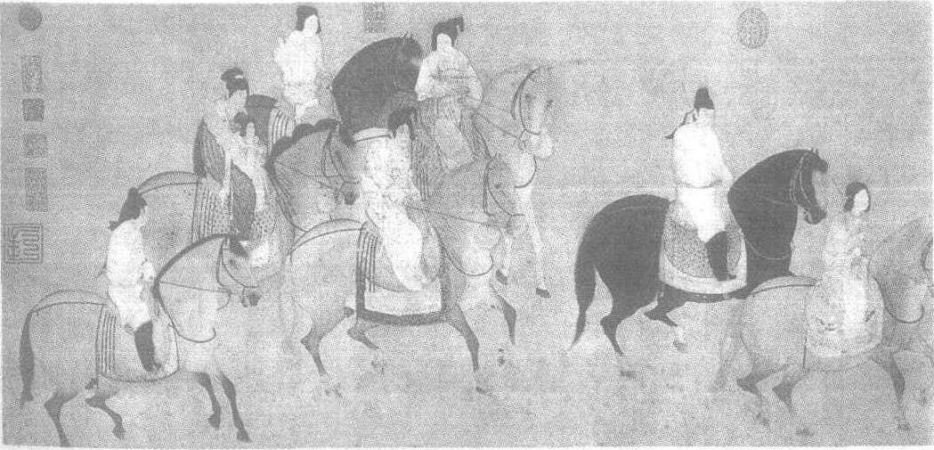| 释义 | 张萱《虢国夫人游春图》 张萱《虢国夫人游春图》长卷,绢本,设色。此图描绘的是唐玄宗的宠妃杨玉环的三姐虢国夫人及其眷从出游的情景。全卷共描绘了八匹马、九个人。前三骑和后三骑是侍从、侍女、保姆。中间的两骑,居于右上的是秦国夫人,侧身向左,正在与虢国夫人述说着什么。虢国夫人仪态端庄,悠然自得。她们身后的一匹马上,一保姆拥着 一女童。孩童被描绘成比例缩小的 “小大人”,体现出当时绘画还存在一定幼稚之处。画卷构图疏朗,节奏轻松。前三骑空疏,后五骑紧凑,错落自然有致。人物表情悠闲慵懒; 马儿步态轻松欢快,紧扣了 “游春” 的主题。其背景处以润笔染出一片蒙胧的草色,使观者领略到了春日郊外的清新和空旷。