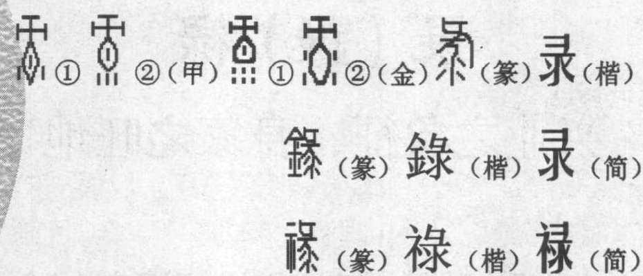 从甲骨文到金文的四个 “录” 字,均为象形文,它们的形体各不相同,但取象和标意却是一致的。 甲骨文和金文的 “录”,其取象有两种: 一是取象于辘轳从井中汲水的形状。 “ ” 在甲骨文中有束扎之意, 在这里是井绳缠系之物的标意; “丅”像井绳下垂,下边所系之物为盛水的器具,左右和下面两个的、三个的、四个的、六个的点状物,是水滴的标意。甲骨文、金文的象形 “录” 字,到小篆时又另造从 “车”,鹿声的形声会意字“辘”字。辘轳,是一种从井中汲水的工具,“车”其标意是和车轮一样能够转动,“鹿”取“录”之音的同时也有辘轳其形状像鹿头的意思。第二种是过滤醪酒的取象。夏商周时期的酒,不作蒸馏处理(蒸馏酒大约是宋代以后才出现的事物),是用布帛类作简单的过滤而直接饮用的。甲骨文、金文的四个形体,都是滤酒工序简单而又象形的白描。甲骨文、金文的象形 “录”字,到小篆时又另造从 “水”,鹿声的形声会意字“漉”字。漉酒,即滤酒,是将粮食发酵后变为酒,然后装入布袋之类的过滤工具,施压使液体(酒液)与固体(酒糟)分离。“ ”具有束扎之意,在这里是施压的标意。小篆的 “录”,试图将 “录” 的象形图解变作会意文字,但变得有些失形。楷书隶作成“冰雪半消”的“录”。 汉字在创造过程中,那种逻辑的一致,义理的统一,音义的互渗,形体的相依,是任何文字系统都难以期及的。“录”的取象源自于汲水和漉酒,作为组字部件,凡与 “录” 所组构的汉字都与酒和水有关: 渌(音录):从水,录声,形声会意字。用辘轳刚从井中打上的一桶清水。水淋淋,关中方言:“水漉漉”。绿:(菉)从糸,录声,形声会意字。“糸”,生命连接延续的系统;水是世间一切生命之源,绿色也是生命之色。“绿蚁” 一词更与漉酒有关。绿蚁是醪酒之类酒面飘浮的粗糟杂质,故以指代酒,白居易《问刘十九》: “绿蚁新醅酒,红泥小火炉。” 逯(音录): 从辶,录声,形声会意字。“辘” 是不可随意行走的,但有了 “辶” (原由 “彳” 与 “止” 组成,标意为人脚的动作),是可以转动的。 碌: 从石,录声,形声会意字。辘轳和碌碡一样,不停的就地转动,却没有转出井绳的缠绕和设定地盘的范围。不停地转动称忙碌; 就地转动曰庸碌。 盝(音录): 从皿,录声,形声会意字。“皿”,器皿,古代漉酒时承接酒液的盛器。上边滤酒,下边用盆钵之类的盛器在接纳,故盝通漉。 醁(音录): 醽醁,古代一种美酒。过滤以后的酒自然醇美。 氯:一种非金属元素,黄绿色,是水的一种净化物质。 《说文》: “录,建首,刻木录录也,象形。”“录”作为组字部件是对的。但“刻木录录”不免胡诌。 “录”是“錄”的初文,“錄”是“录”的孳乳,小篆、楷书的 “錄”,从金,从录,录亦声,为形声会意字。这里的 “录” 从漉酒之意而来。漉酒即滤酒,也即利用“录”的过滤之意造出了这个“錄”字。因此,“錄”具有去粗取精,采纳提纯,遴选优秀的含意。“金” 是铁器出现以后才形成的概念,大约是战国时期的事,在这之前的夏商时代是无所谓“金”的。人们对“金”(在当时是铁)价值的逐步认识、深化,从概念到理念,经历了一个很长的时空过程,以至形成为价值观念的集中内容和财富的象征。“錄” 给“录”脸上贴“金”,不仅表现 “录” 的升值,而且也体现了当时人们的价值观念。 “錄” 字的造出,其构形造义给我们提供了如下两条信息: 一个是体现“錄” 本身的值金量,所谓 “金榜题名时”,“金榜” 即体现了 “錄” 的价值。一是体现被“錄” 者本身的含金量,所谓 “青铺绿隟流璃扉,琼筵玉笥金缕衣”。(南朝刘孝威《拟古应教》诗句)人的一生中如能遇上这个 “錄” 字,自然是一件了不起的事,即使金盆打了,分量还在。金榜题名,“金” 随 “录”至,尽管科举制度从晋代开始逐步完善形成,至今已延续、连用有一千多年的历史,而它含金的成分却重重的凝聚于这个 “錄” 字之中。“錄” 是进入社会上流的一道金色门槛,通向金山的一条大道,如能应 “錄” 对谁来说,都是一生中的点睛之笔。 錄的本意是遴选,从本意引申有: (1)任用,韩愈《进学解》: “占小善者率以錄,名一艺者无不庸。” (庸作任用解) 如錄取、招錄。 (2)记载,《公羊传·隐公十年》:“《春秋》录内而略外。” 如记錄、登錄、錄供。 (3)抄写。如抄錄、摘錄、誊錄。 (4)惦记,《孔雀东南飞》:“君既若见录,不久望君来。” (4)簿籍,陶渊明《拟挽歌辞》: “昨暮同为人,今旦在鬼录。” (5)采纳,汉王充《论衡·别通》: “或观读采取,或弃捐不录。” “籙”在浩如烟海的汉字中,是一个不常用的字,但它富有神韵,却是现代人们常常遇见的事实。“籙”,字书解释: 道士画的能驱使鬼神的图形、符号。“籙” 竹木上刻画的咒符,一旦被 “錄”,即可成为自己或第三者手中的一张鬼混和打鬼的令牌。 《说文》: “錄,金色也。”许慎对 “錄” 的释解很不到位,实在不敢恭维。 简化后的 “录”,取掉了那个露骨的 “金”,当然也取掉了“錄” 的文化古意,剩下的是一只赤裸裸的半伸不展的手(彐)去捞油水了。 如果说 “錄” 偏重于滤酒提纯的引申,那么 “禄”则偏重于井中汲水的引申。 “录” 是“禄” 的初文,“禄” 是 “录” 的孳乳,小篆和楷书以及简化后的 “禄”,一脉相承,从示,从录,录亦声,为形声会意字。“