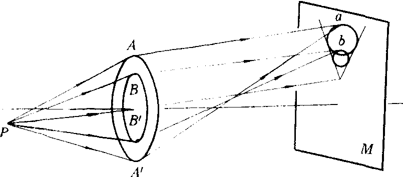 | 释义 | 彗形像差 彗形像差huixing xiangcha近轴物点发出的宽阔光束经光学系统(如透镜、透镜组、反射镜等)所成的像呈一个彗星状光斑的现象。简称彗差。单色像差的一种。是由于光束对光轴的不对称所致。图中示出了凸透镜产生彗差的情况。近轴物点P所发出的宽阔光束经凸透镜成像,通过透镜同一环带的光线在像面上成一圆环形的光斑;但通过不同环带的光线所成的圆环形光斑的大小不同,并且这些圆环形光斑的中心到光轴的距离也不同。例如通过透镜较大环带AA′的光线所成圆环形光斑a的直径也较大,其中心距光轴较远;通过透镜较小环带BB′的光线所成圆环形光斑b的直径也较小,其中心距光轴较近。结果,光线在理想像面M上形成了一系列大小不同、中心不在一点的亮环,它们相互重叠成一个彗星状的光斑。图中的情况是彗星状光斑的尖端离光轴最近,此称正彗差;也有尖端离光轴最远的,称为负彗差。