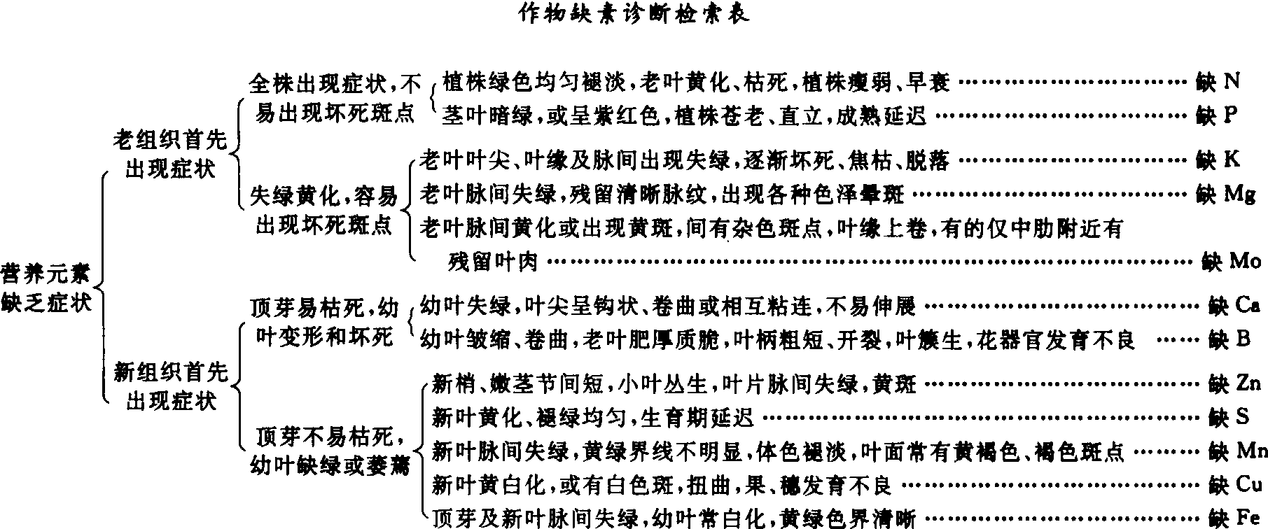 缺素指示植物 对某种元素缺乏特别敏感的植物。当土壤中该元素供应不足时,它首先表现缺乏症,且其症状常具典型性。利用这类植物可以很好指示土壤缺素状况。栽培作物和野生植物中都有许多这类植物,通过栽培指示植物或能以识别野生植物缺素症,有助于掌握土壤的缺素状况。 形态诊断morphological diagnosis根据植物的外部形态来判断植物营养丰缺状况的技术。植物正常生长发育需要从土壤中吸收各种营养元素,若植物缺乏任何一种营养元素(或比例失调),就会扰乱植物体内正常的代谢,并在外部形态表现出某些特有症状。如植物体内缺磷时植株矮小,叶细小,叶色发暗,有的呈紫红色,成熟期延迟。形态诊断只是植物营养诊断的方法之一。它的优点是简便快速,不需要专用的仪器设备,只凭人的视觉、经验或根据前人总结的植物缺素症状检索表即可进行鉴别。但它也有一定的局限性。一般营养潜在缺乏往往不易诊断出来,只有当植物缺素严重时,才能在形态上表现出来,此时再补救为时已晚。另外,植物外形往往受气候环境条件,病虫害等综合因素的影响,有时易造成误诊。因此,形态诊断还需要配合其他的诊断方法才能作出正确的判断。 |