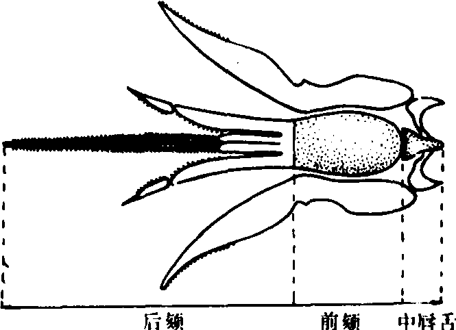 图1 工蜂喙长的测定部位 前翅长和宽 取全部工蜂的右前翅,将其置于载玻片上,在显微镜下用测微尺进行测量。(图2)