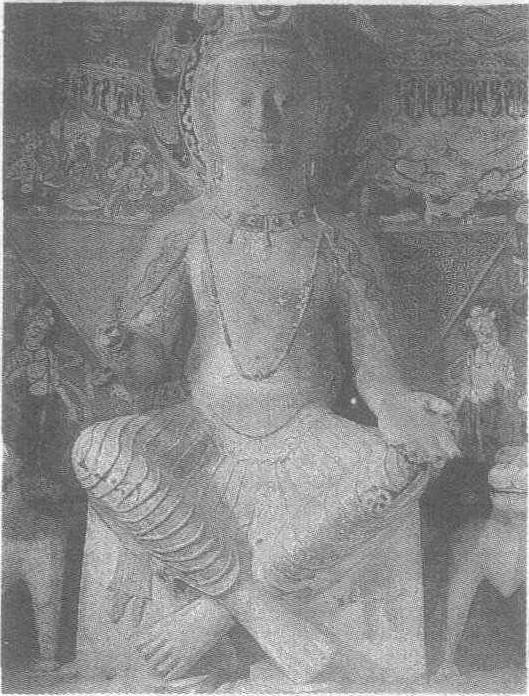 北凉。高335厘米。甘肃省敦煌县莫高窟第275窟西壁前正中塑像。此尊弥勒造像是莫高窟早期所存最大的弥勒像,面形丰圆,眉目疏朗,头戴三珠宝冠,颈佩璎珞,上身裸露,腰束羊肠裙。左手作与愿印,交脚坐于狮座之上。整个塑像比例匀称,其造型及双狮座均明显受犍陀罗艺术影响。但此尊弥勒菩萨的塑造又有中国的独创性。古印度佛教艺术中,佛的坐姿仅有结跏趺坐和倚坐两种形式,此像的交脚坐式则是佛教传入中国后的一种特殊模式。有人认为它出现于这个时代反映的是鲜卑族拓跋氏贵族的一种坐式礼仪。