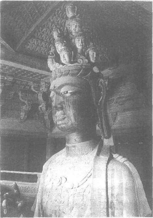辽统和二年(公元984年)。高16米。天津蓟县独乐寺观音阁塑像。独乐寺位于蓟县城西门内,始建于唐代,其主体建筑山门和观音阁为辽代重建。阁内的观音菩萨像直立于中心的部位。身着长裙,胸佩璎珞。左手下垂,右手置于胸前。掌心向外,屈中指和无名指。面相为一男性,端庄英俊,表情严肃。头上有九枚小菩萨像和一枚小佛像,共分四层,小佛像高高地独居其上。此观音像高大健壮,气势宏伟,是我国最大的泥塑之一。