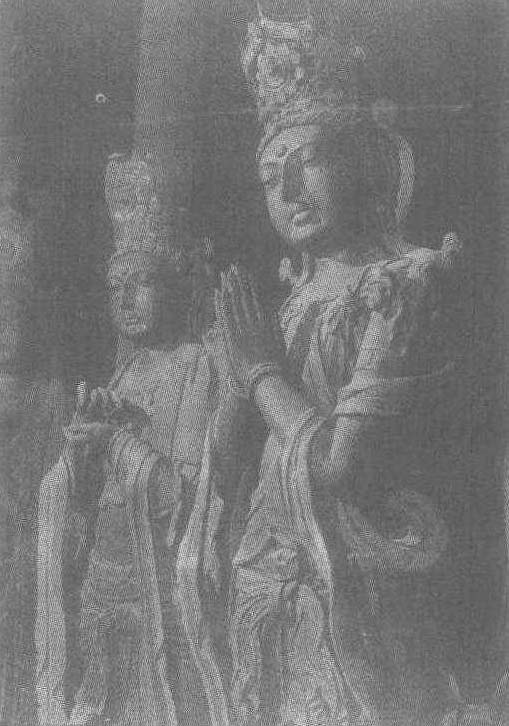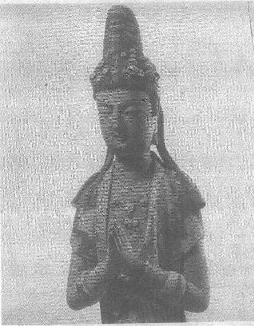 辽重熙七年(公元1038年)。通高3.02米。山西省大同市华严寺薄迦教藏殿内塑像。这尊菩萨上身微裸,天衣绕肩飘然垂于脚下。头戴装饰精美的花冠,身佩塑造细腻的璎珞和臂钏,腰胯轻移,亭亭玉立。脸庞丰腴圆润,头微低,目下视,合十含笑,正沉入参禅悟道的虔诚之中。虽为神像,但其面貌和体态不失凡人少女的美丽和风韵。塑造技艺娴熟潇洒。塑像风格较唐代增加了轻盈和灵秀之美,更符合现代审美观。这尊拨动人们心弦,增添心灵圣洁感的塑像是华严寺中的名尊,也是辽代彩塑艺术的珍品。