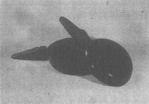 西汉晚期。高11.5厘米,口径17.5厘米,通长30厘米。安徽省天长县安乐乡汉墓出土。安徽省博物馆藏。木胎,圆形,子母口,圈足,柄作张开的鸭嘴状。在鸭颈处设榫卯结构,用手握柄,鸭嘴张则盒闭,鸭嘴闭则盒张。盒内髹朱漆,盒外在黑漆地上,绘朱漆凤鸟纹、神仙纹、云龙纹和几何纹等纹饰。此盒结构巧妙,造型别致,将一只张嘴呱呱呼叫乞食的懒鸭惟妙惟肖地表现出来。