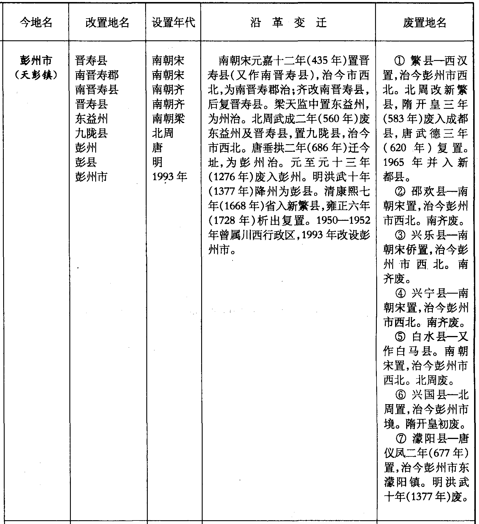 南朝宋元嘉十二年(435年)置晋寿县(又作南晋寿县),治今市西北,为南晋寿郡治;齐改南晋寿县,后复晋寿县。梁天监中置东益州,为州治。北周武成二年(560年)废东益州及晋寿县,置九陇县,治今市西北。唐垂拱二年(686年)迁今址,为彭州治。元至元十三年(1276年)废入彭州。明洪武十年(1377年)降州为彭县。清康熙七年(1668年)省入新繁县,雍正六年(1728年)析出复置。1950—1952年曾属川西行政区,1993年改设彭州市。