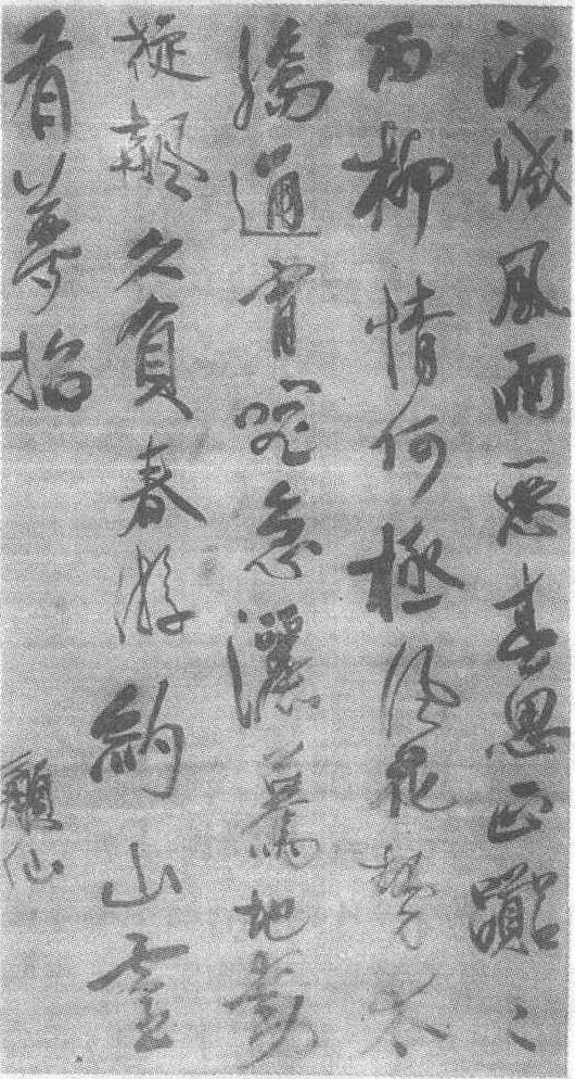 | 释义 | 徐霖行书五言律诗 徐霖行书五言律诗明。绢本。纵198.4厘米,横106.4厘米。江苏省南京博物院藏。徐霖(成化九年—嘉靖二十八年,即公元1473年—1549年),字子仁、子元,号九峰道人、髯翁、髯柏、髯仙,又号快园叟,长洲(今江苏苏州)人,寓居金陵(今南京)。善画山水花卉,精篆刻。九岁能作大字,楷书师欧、颜,后法赵孟頫,尤工篆书,日本使臣得徐霖法书,多珍藏之。明周晕《金陵琐事》云:“徐子仁九岁作大书,操笔成体。正书出入欧、颜;大书初法朱晦翁,几乱其真。后喜赵松雪,笔力遒劲,布局端饬,成一家书。至于篆字得法于异人,更造阃奥;西涯李相国、白岩乔太宰时号篆圣,见则以为不及。”著有《丽藻堂文集》、《快园诗文集》、《续书史会要》等。《明史》卷二百八十六附《顾霖传》有传。此幅草书五言律诗:“江城风雨恶,春思正嚣嚣,雨柳情何极,风花势太骄。通宵嗟急洒,蓦地动旋飙,久负春游约,山灵有梦招。髯仙。”款下钤白文<徐子仁氏>、朱文<髯仙>两长方印。诗书交融,雄沉秀丽,刚中寓柔,给人以淋漓尽致、痛快怡人的感觉。