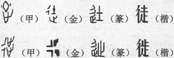 甲骨文的“徒”,是个形声兼会意字。从“止”,从“土”,从土旁两个小点。“止”,是人的一只向上的左脚形象; “土” 下缺一横画是 “土” 离开了地面,土旁的两个小点是动感状态的标示。全字提供给我们的信息是: 由于疾速走动,脚尖上的尘土在飞扬。殷墟卜辞用作步行,如 “子商徒基方。” 是说子商这个人步行到基方国。 金文的 “徒”,将土旁两个小点变作 “彳” (音翅,甲骨文时是道路的象形字,楷书为人的左脚的标意,是汉字中用作动词字的组字部件),将原甲骨文具有象形韵味的 “土” 隶变为具有文字韵味的 “土”,“止” 也是隶变的结果,仍为形声兼会意字。小篆的 “徒”,从“辶”,从“土”,为形声字。楷书的“徒”,从“彳”,从“土”,从 “止”,为形声字(非从 “彳”,从 “走”)。 “徒” 的本义是人快速步行,《易经·贲卦》: “舍车而徒。” 是说不乘车子而快步行走。范晔《后汉书·邓禹传论》: “邓公赢粮徒步,触纷乱而赴光武。”班固《汉书·公孙弘传》: “弘自见为举首,起徒步,数年至宰相封侯。”这里的 “徒步”,表述的是它的本意。从本意引申的有如下义项: (1)步兵。《左传·昭公》二十五年: “帅徒以往,陷西北隅以入。” 如徒兵。 (2)步行。《论语·先进》: “以吾从大夫之后,不可徒行也。” (3)跟随。前头行走,后边随有同类或同一派别的人,如党徒,信徒,学徒,门徒等。 (4)由步行又引申指被罚服劳役或被流放的人。桓玄《讨元显檄》: “驱逐徒拨,死叛殆尽。” (5)由被罚服役又引申为刑罚名。徒刑,古代五刑之一,陶宗仪《南村辍耕录·五刑》: “国初立法以来,有笞、杖、徒、流、死之制。” 故徒刑是今司法的常用述语。 (6)由步行无所凭借,又引申出形容空、只有、仅仅等意。《孟子·离娄上》: “徒善不足以为政,徒法不能以自行。”《孔雀东南飞》: “妾不堪驱使,徒留无所施。”《史记·廉颇蔺相如列传》:“而蔺相如徒以口舌之劳,而位居我上。”这里的“徒”均具有空白、徒然、只有、仅仅等意域。如成语徒有虚名、徒劳无益、徒手空拳、家徒四壁、徒托空言等。 (7)古代平民出行无车,故以徒为平民与众人的代称,《后汉书·仲长统传》: “豪人之家,连栋数百,膏田满野,奴婢千群,徒附万计。” 《说文》: “徒,步行也。从辶,土声。” “徒” 是标示人的动感状态的字,如果说它的意境一般是人的单独行为的话,那么,“徙”就不同了。“徙”则是标示人的群体、整体挪动的用字。 甲骨文的 “徙”,从 “彳”,从 “止”、“止”,为会意字。“彳” 是道路的标意,“止” 是人的左脚的标意,两只左脚一前一后(与“步”有别),朝一个方向前行。“徙” 提供给我们的信息是: 路上留有许多人的脚印或许多人在路上行走。 金文的“徙”,从“彳”,从“步”,为会意字。“彳”是道路的标意,两只一左一右的黑脚,正迈着步子在大路上行走。可是,徙的 “众多人在路上行走” 的寓意却断然失却。小篆的 “徙”,讹作从 “辶”,从 “止”; 楷书的 “徙”,终于返回到甲骨文的字形,从 “彳” 从“止”、“止”。 《说文》: “徙,移也。从辶,止声。”许慎析形有误,释义也欠确切。 “徙” 的本意是许多人在路上行走。引申有迁移之意。《史记·秦始皇本纪》: “徙天下豪富于咸阳十二万户。” 由于“徙”有挪动、移动、变迁、易位等含意,因此便演绎与产生出许多新的双音和多音词组: 徙木,说的是战国时代秦国商鞅变法的故事。变法初鞅恐民不信,乃先在咸阳国都南门立三丈之木,募民能挪至北门者赐十金。民众有疑虑,不敢挪动。鞅又下令,能挪者赐五十金。后有一人徙之,即赐五十金,以示说到做到,取信于民。于是颁布新法,令行于民。唐代刘禹锡总结说: “徙木之信必行,则民不惑,此政之先也。” 徙宅,传说孟子年幼时,邻里环境不好,他的母亲曾三次迁居,才使他得到比较好的学习环境。后来,徙宅为母教的通称,诗文中也常以此为典,元代藤安上《有怀》就有: “三徙终蒙黄卷力,百年不假白头亲” 的诗句。 徙宅忘妻,是古代寓言,说的是一个人乔迁新居,却忘了携带自己的妻子。出自《孔子家语·贤居》,哀公问孔子曰:“寡人闻忘之甚者,徙宅而忘其妻,有诸?”后用来比喻办事荒唐粗心,致力于次要方面而忽略了主要方面。 还有迁徙,搬迁、转移等意,贾谊《过秦论》: “然陈涉瓮牖绳枢之子,甿隶之人,而迁徙之徒也。” 因此把犯人流放到边远之地服役称徙边;迁地居住,改变籍贯者称徙贯。 “徙”的本意是许多人在路上行走。因此,凡用“徙”所组成的汉字,都与鞋和走路有关: 漇(音细): 露珠将鞋衣浸湿。《楚辞·招隐士》:“淒淒兮漇漇。” 注: “淒淒漇漇,毛衣若濡也。” 蓰(音细): 五倍为蓰。大步行走,跨越摇摆,鞋与跨度之比。《古乐府·皑如山上雪》:“竹竿何嫋嫋,鱼尾何蓰蓰。” 蹝(音细): 草鞋。《孟子·尽心》上: “舜视弃天下,犹弃敝蹝也。” 𫅥(音尸): 古时一种无后跟的鞋(相当于今时的拖鞋)。 屣(音细): 穿鞋而不拔上鞋跟,形容行走急遽,《后汉书·王符传》:皇甫规素闻符名 “衣不及带,屣履出迎。” 簁(音细): 走起路来摆动的样子,韩愈诗句: “宿云寒不卷,春雪坠如簁。” 如果说“陟”、“降”是人类使用双脚在空间上下两极纵向活动的话,那么 “徒”、徙 “就是人类使用双脚在空间前后左右面向