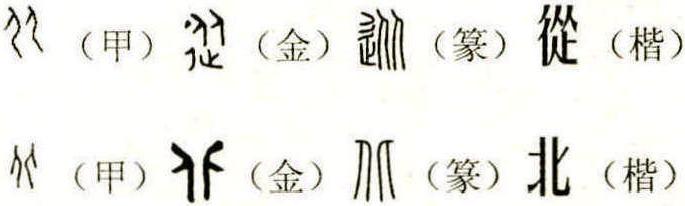 從、比、北、化,從原創性奧旨講,都是標示人的倫理概念;都是標示人的家庭男女之事的倫理概念;都是標示偶婚家庭男女之事倫理中事物變化的道理。 於是,得先“人”之重提❶。 人,甲骨文作“ ”,金文作“ ”,小篆作“ ”。說它是個象形字也並無大礙,但確切地說它應該是個會意字。它是由陰陽兩個爻符轉換而來,直畫為陽,曲畫為陰,穿鑿天地,道法自然。“人”的架構是陰陽合體,人的靈肉是陰陽氣象。稀釋了“人”就與“從、比、北、化”更加接近了。 先從“从”說起。 甲骨文的從作“ ”,是一前一後兩個向左行走的人,為會意字。概括地說,華夏民族“男左女右”的習俗源遠流長,它自然出自乾坤陰陽的定理。詳細地說,前邊這個人,是由少陽符號“⚎”轉換而來,少陽位左,在東方,為長男;後邊那個人,本由少陰符號“⚍”轉換而來,少陰位右,在西方,為少女,她本是西向的,這時調轉了方向,故謂“從”。《易經·乾》九五:“子曰:同聲相應,同氣相求。水流濕,火就燥。雲從龍,風從虎”,是說“從”的原理。在《易》的定義中,乾為天為父;坤為地為母;男為健,女為順。這個“从”一般是指家庭中陰陽匹配、乾坤造就一對剛柔,主從定位分明的角色。 《易經·家人》彖曰:“女正位乎內,男正位乎外,男女正,天地之大義也。”又曰:“家人有嚴君焉,父母之謂也。”彖辭是卦的綱領性概括,這裏說女主內,男主外是天地造就的。地法天,故女主的角色是順從。 “從”的要義是家庭中,男女正位上,女從男的主從關係。有人會提出質疑:這不是重男輕女?不是得,其理由: (1)這個“從”只限定在家庭; (2)這個“從”是天地之大義,是家庭中由男女的生理、事理所規定; (3)“男女平等”指的是人的社會人格,一般與此“主從”無涉。 萬物之始,大道至簡,衍化至繁。無論是“順從”還是“服從”,都應該是行動上的“從”,而不是表面形式上的“从”,故金文的“從”( ),給男女各增加一隻左腳(彳、止都是人的左腳的標意)。腳是行動符號,左腳又是起步之腳,其表意有二:(1)“從”是行為上的從: (2)起步一致。這是古人為了“從”在定義上的準確,對甲骨文實行的加畫處理,使得此“從”與彼“从”比,更加周全,更加合理,這是文字在長期流變中的一種繁化,一個進步。 小篆的“從”( ),其元素與金文無別,只是在結構上作了些調整,其表意不變。楷書隸作“從”,壓縮了“从”在空間上的三分之二,這也是突出和注重行為的標意。“從”殷墟卜辭用作: (1)隨從,“登人呼從爵,叶王事”。 (2)跟從,“令戉從□”。 (3)順從,“今日奏舞,有從雨。”“從雨”郭沫若先生釋為縱雨,即大暴雨,愚以為應是“順雨”,至今不是還有“風調雨順”的成語存在嗎? (4)起自,“從向歸,乃于盂”。 (5)人名,“唯□令從璞周”。 “從”的本意是家庭中的女從男。引伸有以下意義: (1)跟隨,《論語·微子》:“子路從而後。” (2)追隨,《左傳·莊公十年》:“可以一戰,戰則請從。” (3)歸順,《左傳·莊公十年》:“小惠未遍,民弗從也。” (4)參與,如從事,從政,從軍等。 (5)由、自(介詞),《詩經·小雅·何人斯》:“伊誰云從。” “从”,“從”也異構了許多漢字。 (一)以“从”的異構: (并):從一。 橫向單行曰并。 故加女為“姘”。 “从”的比肩曰“並”。並加石為“碰”;加日為普遍的“普”。 (旅):從。 母系族落隨從母或祖母的遷徙。众:從人。眾人并立。“众”又異構了“眾”、“聚”等字。 (二)以“從”的異構: 傱:(ㄙㄨㄥ)從人。多人從一而疾行,《漢書·揚雄傳·甘泉賦》:“風傱傱而扶轄兮。” 豵:(ㄗㄨㄥ)從豕。豬一歲曰豵。豬生殖力甚強(放縱),故貶斥之。 㙡: (ㄗㄨㄥ)從土。縱向土中生長的一種菌體。 摐:(ㄔㄨㄤ)從手。以手樹起的高聳。 樅:(ㄘㄨㄥ)從木。樹木是縱向生長,故是隆起的表意,《詩經·大雅·靈臺》:“虡業維樅,賁鼓維鏞。” 瑽:(ㄘㄨㄥ)從玉。玉縱向擺動,發出“瑽瑽”的撞擊聲。 縱:(ㄘㄨㄥ)從禾。縱向的移挪禾苗。 蓯:從草。草有掩苫意,(ㄘㄨㄥ)藥名,“從”埋在沙土中的形狀;(ㄙㄨㄥ)動作,縱向的下入,“衝蓯”是“從”相互的糾結。 暰:(ㄘㄨㄥ)從日。《玉篇》:縱向,上下的“閃電”。 瞛:(ㄘㄨㄥ)從目。并而視之,故為明亮。 慫:(ㄙㄨㄥ)從心。以“心”給“從”的勉力。 蹤:(ㄗㄨㄥ)從足。“從”的足跡,《漢書 ·揚雄傳 ·河車賦》:“軼五帝之遐跡兮,躡三皇之高蹤。”(今簡作“踪”) 縱:從糸。糸,生殖上的裔支下延。糸是縱向的表意,與“從”的橫向相對,故有恣肆、放任、犯氾、騰躍等意。 聳:(ㄙㄨㄥ)從耳。“從”本為橫向運動,與耳疊合: (1)對耳的堵塞,故本意為聾; (2)來自高處的聽聞,故有高起、驚懼意。 𩞆:(ㄔㄨㄤ)從食。 食,趨之若騖。 “從”的結果是“食”(本指食色)。《廣韻》釋:“饞,愛食。”《集韻》:釋“欲食也。” 因此《說文》僅釋“從,相聽也”,聽從僅是“從”的一個引伸之意。 “从”,起初是家庭出現以後,家庭中夫婦主從關係的表意。人類社會在不斷發展,無論是物質生活還是精神生活都越來越寬泛,越來越復雜,當然就不滿足甲骨文時期的那種單純的妻對夫的順從了,於是給“从”增加行為符號“彳”和“止”,就是很自然的事了。 “从”和“從”都需要掩卷籌思的。“从”是女性或家庭主婦的心理、生理、事理上的一種生命過程或生活方式,並非