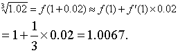 | 释义 | 微分在近似计算上的应用 微分在近似计算上的应用weffen zai jinsi jisuan shangde yingyong设f (x)是可微函数. 由于当|△x|很小时,函数的改变量与微分之差| △y-dy|比|△x|小得多,而dy又比△y容易计算,所以用dy近似代替△y是有实际意义的. △y =f(x0 +△x)-f(x0)≈f′(x0)△x 计算函数改变量的近似值.❷利用公式 f (x0 +△x)≈f(x0)+f′ (x0)△x 或 f(x)≈f(x0)+f′ (x0) (x -x0) (1) 计算函数值的近似值.用微分作上述的近似计算,首先要根据问题的需要确定函数f (x);然后恰当地选择x0与△x的值,使得f (x0),f ′ (x0)容易计算,且|△x|尽可能小. 例 求 的近似值.解 可取 x0= 1,△x= 0. 02. 于是
