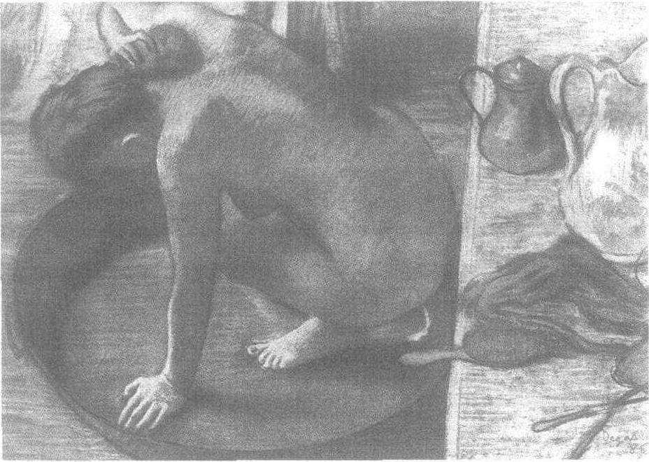 德加这种追求 一瞬即逝的效果,在他画的浴女图中也能看出来,她们的姿态似乎有 一种从钥匙孔里被窥察到的感觉。德加这种处理方式,在当时和马奈一样,曾引起人们猛烈的抨击。然而他坚持主张人体的描绘不应脱离现实的生活环境,而且画了无以数计的沐浴中以及浴后的妇女素描和粉彩画。一次,有人问他 “先生,为何你总画这么丑的女人?”他回答到: “夫人,因为一般言之,女人都是丑的。”但实际上他笔下的女人,几乎个个风姿均在普通标准以上,当然他不故意使其特别引起注意罢了。这个在几近所有人体画里极具重要性的因素,被他严格地摒除在外了。他的目标只是想用线条来传达动态,如同意大利文艺复兴时的人物画大师们那样。