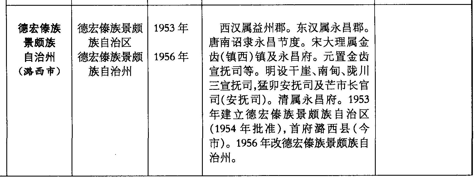 德宏傣族景颇族自治州(潞西市)德宏傣族景颇族自治区德宏傣族景颇族自治州1953年1956年西汉属益州郡。东汉属永昌郡。唐南诏隶永昌节度。宋大理属金齿(镇西)镇及永昌府。元置金齿宣抚司等。明设干崖、南甸、陇川三宣抚司,猛卯安抚司及芒市长官司(安抚司)。清属永昌府。1953年建立德宏傣族景颇族自治区(1954年批准),首府潞西县(今市)。1956年改德宏傣族景颇族自治州。