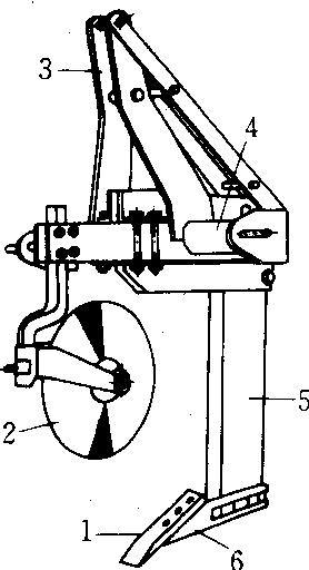 1. 心土铲 2. 圆犁刀 3. 悬挂架 4.悬挂轴 5. 犁柱 6.铲托