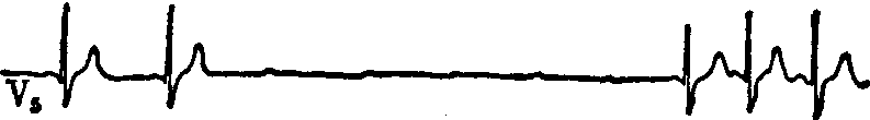 心室活动短暂或较长时间停顿,而心房活动依然存在的,称为心室停顿。为完全性房室传导阻滞的一种表现,多由三束支阻滞引起。阻滞部位以下的起搏点自律功能暂停,以致长时期既无兴奋下传,又无逸脱心搏激动心室。心电图表现为一系列心房波(窦性或房性),但无相应的QRS波群或逸脱心搏(图)。临床表现为心脏骤停,短暂心室停顿可无症状,停顿较长可诱发心原性昏厥。病因和治疗三束支传导阻滞(见“心室内传导阻滞”和“心搏骤停和心肺复苏”条)。