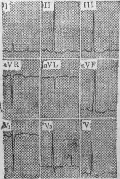 图3 右心室肥大心电图 右心室肥大的心电图表现除上述QRS波群形态的改变外还有: ❶Rv1>1.0mV或R′>1.5mV,Rv1+Sv5>1.2mV,Sv5>0.7mV,V1R/S>1及V5 R/S<1; ❷RaVR>0.5mV,R/Q>1; ❸额面QRS电轴显著右偏≥+110°; ❹VATV1>0.03s; ❺QRS时限<0.12s; ❻V1的ST段压低超过0.05mV及T波倒置,以及 ❼右心房肥大。上述指标中一般以V1R/S>1及V5R/S<1;V1或V3R呈qR、R、Rs或V1~V5呈rS型、RV1>1.0mV;电轴≥+110°及V1的ST-T改变等的诊断意义较大。其他如aVR的R/Q>1; RaVR>0.5mV;VATV1及QRS时限轻度延长及右心房肥大等;可做为辅助诊断条件。一般来说,阳性指标愈多,超过正常值范围愈大,则诊断的可靠性越高。虽然心电图对诊断明显的右心室肥大准确性较高,但早期发现,还有一定困难。另外,尚需注意与A型预激综合征、右束支传导阻滞、左中隔分支传导阻滞、后壁心肌梗塞及肺气肿等鉴别。 双侧心室肥大 双侧心室肥大的心电图表现: ❶大致正常心电图,这是由于左右两侧心室除极向量电压同时增高,互相抵消所致; ❷单侧心室肥大心电图,只表现出占优势的一侧心室肥大,而另一侧心室肥大的图形被掩盖; ❸双侧心室肥大心电图,少数病人可同时显示明确的左、右心室肥大的心电图特征,或具有明确的一侧心室肥大的心电图特征,同时又存在对侧心室肥大的某些征象。