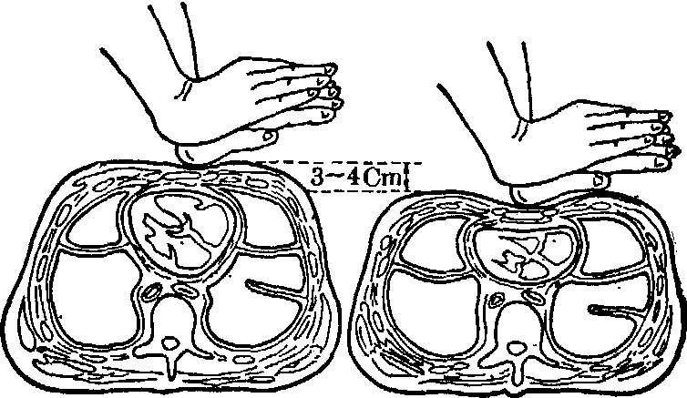 图1 胸外心脏按压示意 注意事项: ❶按压时用力不可过大,以免引起肋骨骨折、心包积血、肝破裂等并发症; 也要避免按压过轻而达不到维持有效循环的要求。 ❷要按压在胸骨下半段的上2/3处,手指应不接触病人胸部,这样按压范围不大,位置准确,效果好,且不易引起骨折和器官损伤。 ❸借助身体下压的力量稳健并有节奏性,避免突然或急撞的动作。压下后持续约0.5s,突然放松,以利血液回流到心脏。掌跟不要离开按压处。 ❹每分钟按压数约70次为宜,过多会影响心脏充盈;太少会使心排血量降低。按压时的心搏量,仅为自然心搏量的40%左右。胸外心脏按压如操作正确,可在颈动脉产生100mmHg以上的收缩压峰值,平均压约40~50mmHg,占约为正常的血流量的35%。 ❺不论心电图记录为何种心律,必须继续按压,直到有效的自动心搏恢复为止。 ❻自动心搏未恢复前,尽量不要中断按压,因首8~10次按压时,心排血量累增,即使短暂停止,亦将影响心排血量。必须暂停按压时(如心内注射,测心电图,换操作者等),每次勿超过10~15s。 心脏按压有效的表现: 周围大动脉(颈、股)能扪到搏动,上肢收缩期血压在60mmHg左右;颜面、口唇和皮肤色泽转红润; 瞳孔缩小; 自主呼吸恢复; 眼睫毛反射恢复;肌张力好;病人开始挣扎,甚至发音。 瞳孔固定及散大达30 min,深昏迷和无自主呼吸,为大脑死亡的征象。持续心脏按压一小时,心电图仍无心电活动征象,为心脏死亡。 ![]()