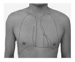 一般嘱患者取仰卧位,检查者用指指叩诊法(见下图):左手中指紧贴胸壁与心脏外缘平行,也可紧贴肋间隙与肋间平行,从肺脏向心脏方向叩诊。叩诊心脏右界时,自肝浊音界的上1个肋间开始,依次按肋间上移至第2肋间为止;叩诊心脏左界时,则自心尖搏动的肋间开始,从心尖搏动外2~3cm处由外向内进行叩诊,并依次上移至第2肋间为止。当沿肋间隙由外向内叩诊时,叩诊音由清音变为比较浊的叩诊音时,此浊音的界线即为心脏相对浊音界;越过相对浊音界继续向内叩诊或行普累施法叩诊,叩诊音变为实音时,此界为心脏绝对浊音界;从第2肋间向上叩出一轻度浊音区,即为心上浊音区。正常成人心脏左右相对浊音界距前正中线的距离见“正常心界”。