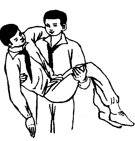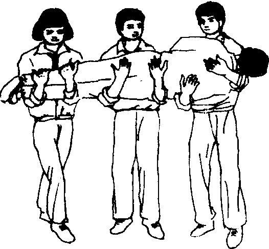 ❷抱持法。把伤员的一臂挂在自己的肩上,然后用一手托住其背部,另一手托住大腿将伤员抱起(图2)。这种方法适用于伤势较轻、神志清醒的伤员。 ❸托椅式搬运法。两名急救者相对而立,各以一手握住对方的前臂,另一手互搭在对方的肩上。伤员坐在急救者互握的手上,两手分别搭于他们的肩上(图3)。此法适用于足部损伤而行走困难的伤员。 ❹卧式三人搬运法。三名救护者同站于伤员的一侧。 ![]()