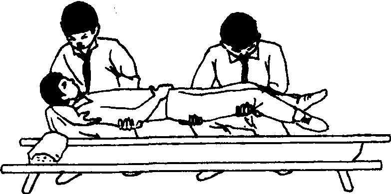 担架搬运法 对腰椎骨折的伤员应尽量避免骨折部位的移动, 更不能让伤员坐起来, 以免引起脊髓损伤。搬运时应准备好木板担架(或门板、木板床), 由两个人同时将伤员轻轻搬到担架上,取仰卧位(图5)。