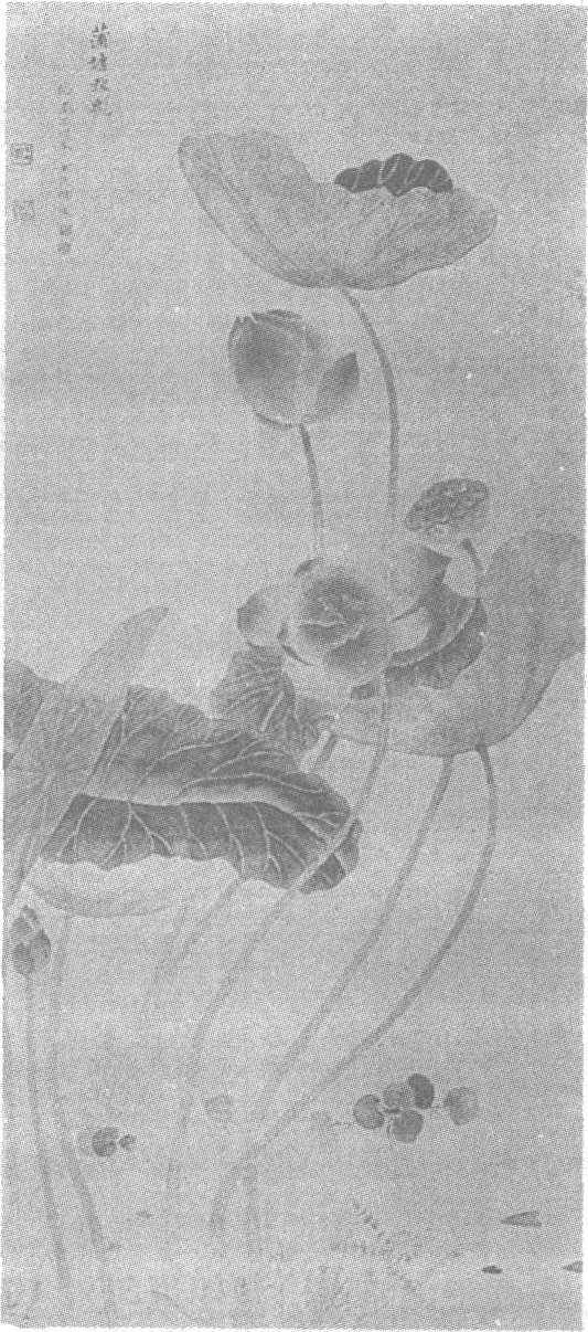 清。恽冰绘。纸本设色。纵127.7厘米,横56.6厘米。北京故宫博物院藏。恽冰生卒年不详,字清於,号浩如,又号兰陵女史,江苏常州人。善画花果,用粉精纯,作品多题小诗,是吴中小有名气女画家。活动于康熙年间。此图画水中荷花,出淤泥而不染,荷叶随水波作浮动之态,清逸爽目。荷花盛开呈粉红色,娇艳欲滴;有的含苞待放,莲蓬挺立。荷叶姿态婀娜,娉婷玉立。用没骨法,晕染工整,设色清爽,花瓣和花叶颜色的深浅变化以及花叶的茎脉都表现得形象逼真,颇富质感。池塘中还画有浮萍水藻和叶片,在水中漂浮。构图巧妙,意境清旷,荷塘呈现一派浓浓的秋意。左上自识:“蒲塘秋艳,南田公本,女氏恽冰。”下钤〈恽冰〉、〈清於〉两方印。