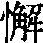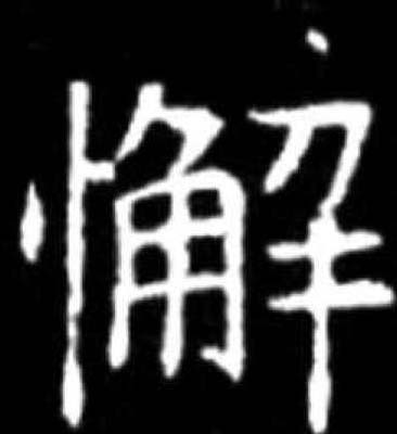 【提示】角, 里面是 , 下端出头; 旧字形里面是土。角的第三笔是竖撇,不是竖;角中间的两横,宋体与左右两边相接,楷体与左右两边相离。 *懈xiè16画 心部 怠惰;不紧张: ~怠|~劲|松~|坚持不~。 懈 ☚ 怠 憜 ☛ 懈xiè战国以来的形声字。从心,从解,解亦声。声母演变如解蟹邂、夹侠、揭歇例。指懈怠,懒惰。组词如:懈怠。略引申为松懈,不紧张。如:始终不懈。组词如:松懈。 懈★常◎常