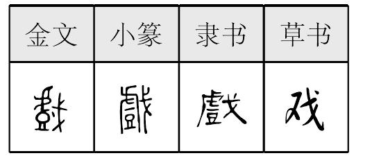 【释义】《说文》:“三军之偏也。”本义是军队中侧翼的部队。在古书中多表示角力、角斗。后引申指游戏、歌舞表演。戏剧形成后,又指称戏剧。戏最初是勇壮之士的角力比试,后来成为一种角斗表演,当角斗的功能退化,只剩下表演功能,就逐渐演变成戏剧的性质。