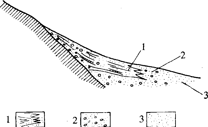 崩积物 山地悬崖峡谷和较陡斜坡上,在风化岩屑和土体在重力作用下,崩塌到下部形成山麓堆积坡,由大小不等的崩塌岩屑及斜坡上的土体物质混杂组成。岩屑呈角砾状,分选性差。在这种母质上多发育成粗质地、多石质、肥力差的幼年土壤。在坡脚地带细粒物质含量增加,可以发育成较肥沃的土壤。但是崩积物分布范围小,地形不平坦,难于通行,土壤理化性状不良。 坡积物 山地、台地、丘陵的风化物质在重力和水流联合作用下移运到斜坡的坡麓,形成平缓倾斜的坡积裙堆积物,叫做坡积物。坡积物的特征是物质的分选性差,具有与坡面倾斜一致的不清晰斜层理。其碎屑物质呈棱角状。在坡积裙的上部,堆积物较粗,越向下部细粒物质越多,堆积层越厚,水分状况较好,可以发育成肥沃的土壤(图2)。通常山区高地周围都是坡积物的倾斜平原。