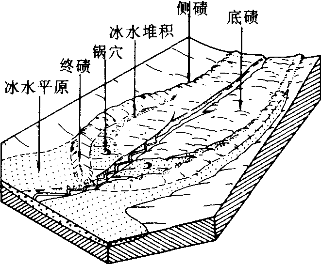 冰碛和冰水沉积物 冰川可以携带大量已风化和未风化的岩块和碎屑物质移动,当冰川融化以后这些物质就堆积下来,形成冰碛物。冰川的末端堆积物呈弧形垄岗,称终碛垄,冰川两侧的堆积物呈带状延伸的高地,称侧碛堤(图8)。终碛垄、侧碛堤一般具有独特的外貌,所形成的土壤由于坡度大,范围小在农业上并不重要。冰川退缩时,在冰床上可留下较薄而平坦的沉积物,称底碛物,它是冰碛物中范围最广的。冰碛物常由未分选的漂砾、石砾、砂、粉粒和粘粒混杂组成,但有些地方也出现过流水的分选现象。有些冰碛物粗粒成分多,另一些则细粒成分较多。冰碛物发育的土壤质地是最不均一的。