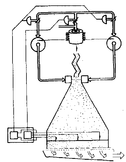正弦波形气流成型机示意图 定向成型 是依靠静电电场使纤维定向排列。该法可以很好地利用纤维本身的固有强度,按纵、横方向有规律地排列,增大其接触面积,并可充分发挥胶粘剂的作用,是提高纤维板质量的有效的方法。但这种方法, 要求纤维的分散度高, 纤维的长宽比以10:1为宜,而且纤维的含水率要控制在10~20%。纤维含水率过低不易极化,过高又易产生电弧不利于纤维的定向。 正弦波形气流成型 是当前干法纤维板生产较为新颖的成型方法。其设备如图。纤维通过Z字型下料管,两侧有气流交替吹风,使纤维成正弦曲线状态下落。该机附设有横向三点厚度检测仪和电子计量秤以及完善的控制装置,用来检测控制成型板坯的质量。 见纤维成型机。成型shaping |