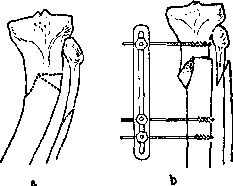 术前须根据X线片准确地测定截骨的位置、方向和角度。术时根据骨性标志测出截骨线和角度。最好选择在松质骨多、血液供给好、断面宽、容易愈合的部位截骨,截骨平面不要进入任何存在的病灶。要求截骨面平整,使两断端紧密接合。采用有效的内固定,最好能在断端间有一定的压缩力。在长骨端截骨时,于截骨线两侧先穿入斯氏针,便于控制断端位置。必要时加用植骨术以促进愈合。术后用外固定,保证在畸形矫正位愈合。
