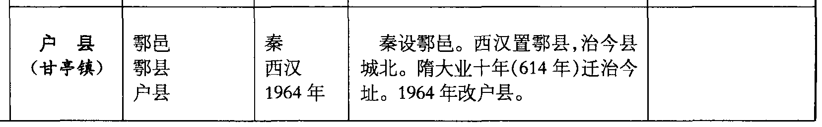 户县(甘亭镇)鄠邑鄠县户县秦西汉1964年秦设鄠邑。西汉置鄠县,治今县城北。隋大业十年(614年)迁治今址。1964年改户县。