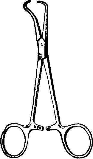 组织钳: 用以夹持组织,尖端有齿,一般只用于夹持皮与筋膜,作牵拉之用。普通组织钳有齿,咬合时易损伤组织,实际应用范围不广。另有一种肠钳,用以夹持肠胃。形式类似组织钳、无齿、钳夹时器械弹性较大,损伤性小,能用以夹持空腔内脏(图6)。