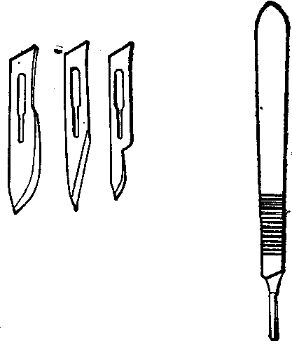 手术刀: 有固定刀和可更换刀片的手术刀,目前都采用后者,以便在刀片变钝或损坏时随时更换。根据刀刃的式样又分为大圆刃、小圆刃、尖刃、弯刃等。圆刃刀用途最广,作切开皮肤和皮下组织之用。尖刃刀刀尖锋