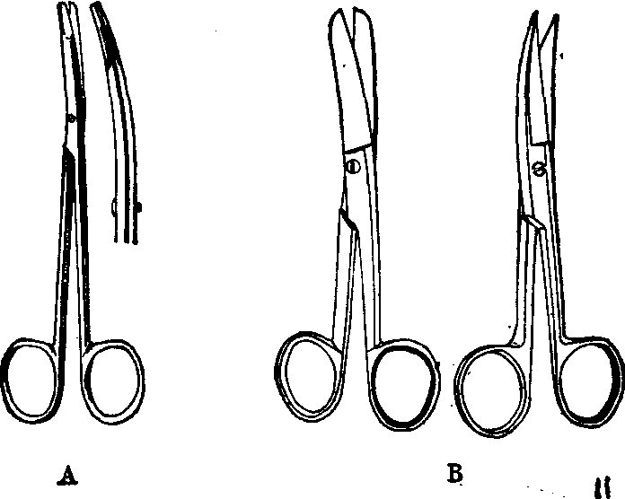 手术剪: 可分为组织剪和线剪二大类; 组织剪用于作锐性分离和剪切组织之用,要求钢的质量较高,制作要精细,大多为小圆头,刃薄而锐利,必须小心使用和保养,勿用以剪硬性物,也不应用以剪线或敷料,引流管等物。组织剪有弯头、直头、长柄短翼等种类,依手术的类型和部位而选用。长剪用于胸腔、盆腔等深部手术,大多为弯头,以免使用时遮住手术者的视线。线剪大多为尖头直剪,也有一翼为尖头、另一翼为钝头的(图3)。