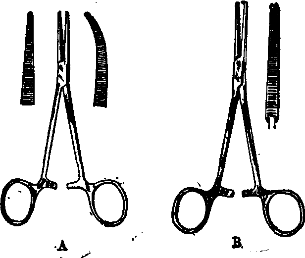 血管钳: 用以止血。有尖端带钩和不带钩的,直的和弯的,以及蚊式血管钳等数十种。止血钳的长度和钳端有各种类型,有的头部钳夹内有横纹,有的有直纹,使血管和组织钳夹后不易滑脱。使用时止血钳以尖端垂直夹住出血血管及少许周围组织,止血钳的大小应与血管管径的大小相称(图4)。