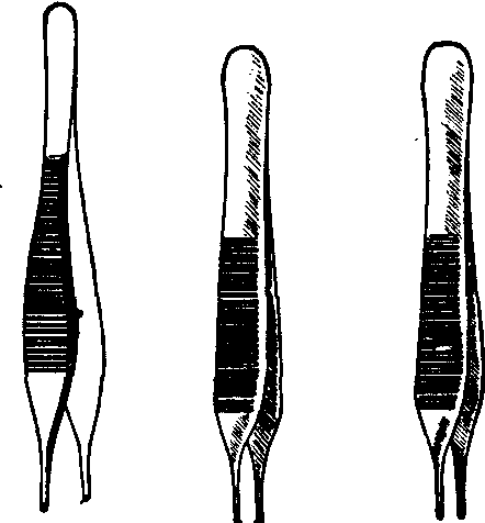 手术镊: 手术操作时用以提起组织,有尖端带钩齿和无钩齿的两种。有齿的镊子在解剖或缝合时作提拉皮肤、皮下组织、筋膜和肌肉之用; 无齿镊用以解剖较精细的组织,如神经、血管等(图9)。